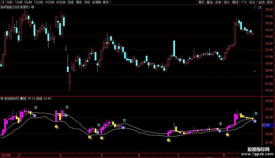 DRAWTEXT(REF(VAR2,1)>VAR1 AND VAR2=0,XHIGH*1.05,'卖'),COLORFFFF00;
