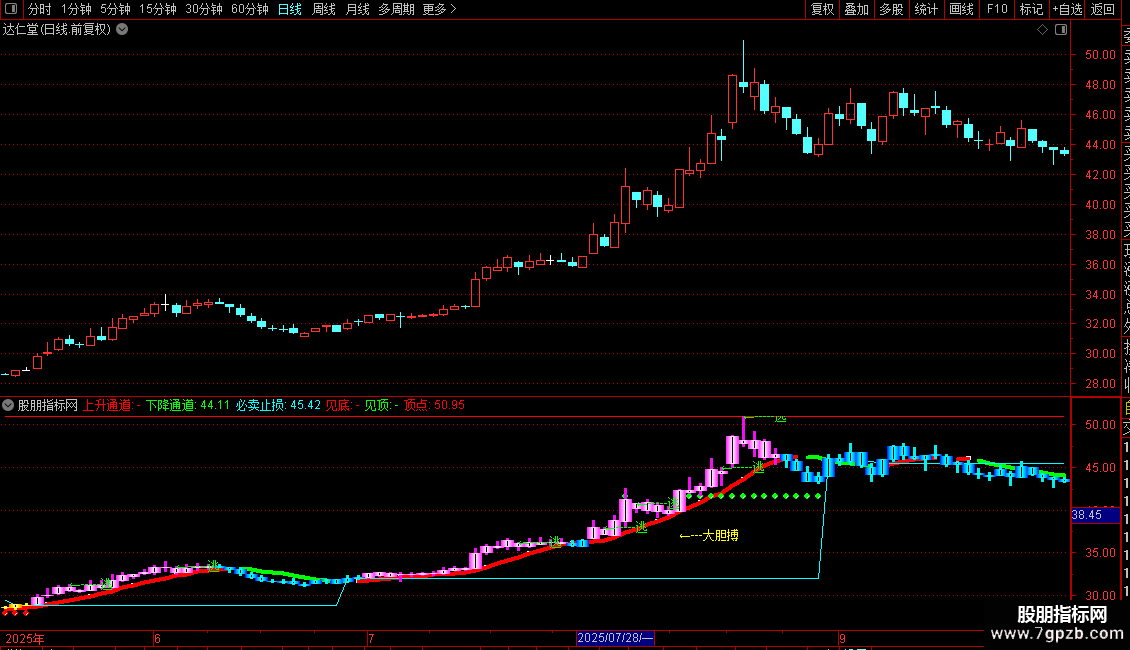 大胆搏信号:当出现特定放量上涨形态(涨幅>5%,收盘接近当日最高价)时,在低价位标记“←---大胆搏”的黄色文字。