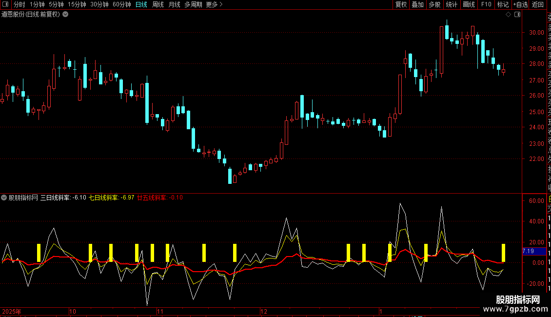廿五线斜率:基于25日EMA计算,反映长期趋势的斜率变化,以红色粗线显示。