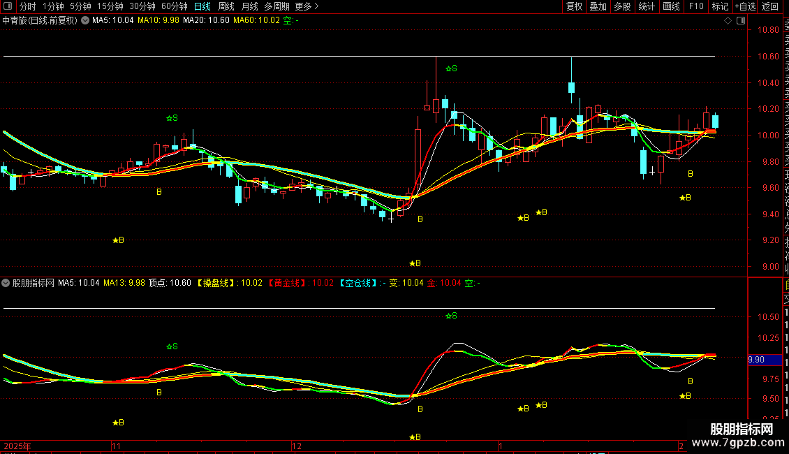 DRAWTEXT(CROSS(DA,【操盘线】),【操盘线】-0.5,'★B'),COLORYELLOW,LINETHICK1;