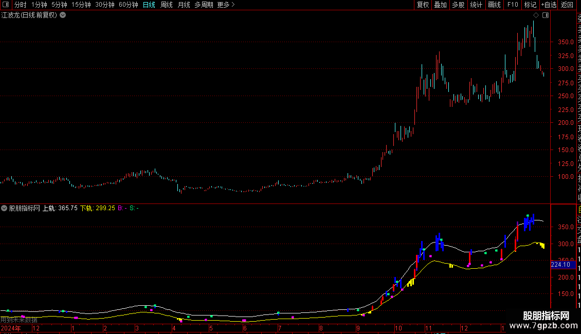 STICKLINE(LOW<下轨*0.99,LOW,下轨,1,0)COLORYELLOW;