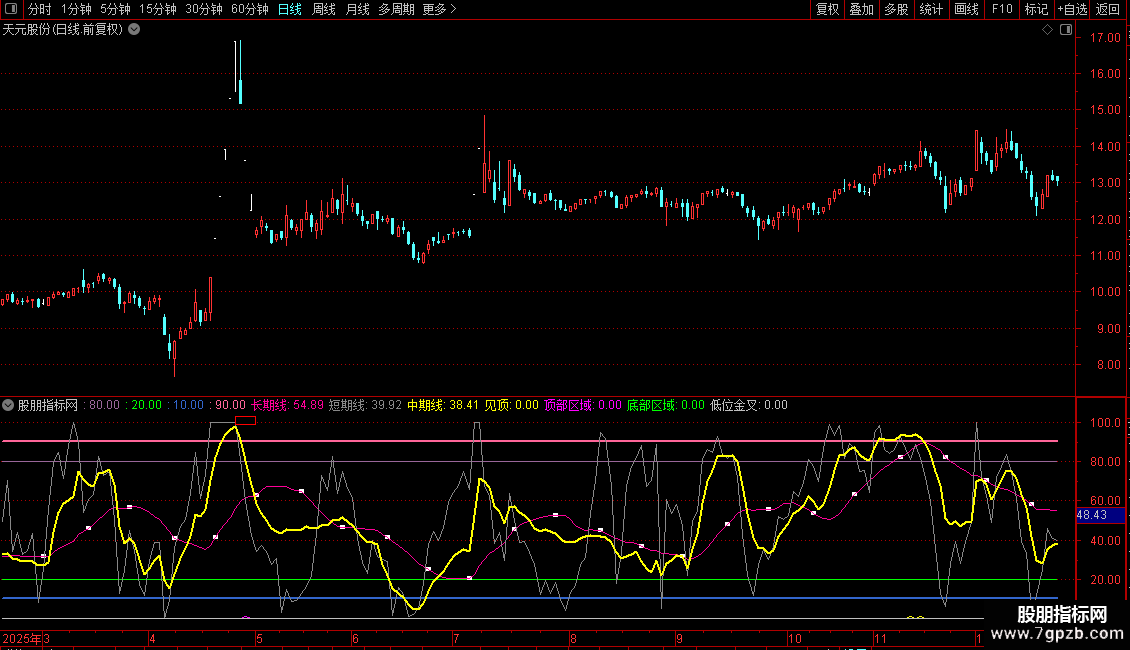 顶部区域:(中期线<REF(中期线,1) AND REF(中期线,1)>80) AND (REF(短期线,1)>95 OR REF(短期线,2)>95 ) AND 长期线>60 AND 短期线<83.5