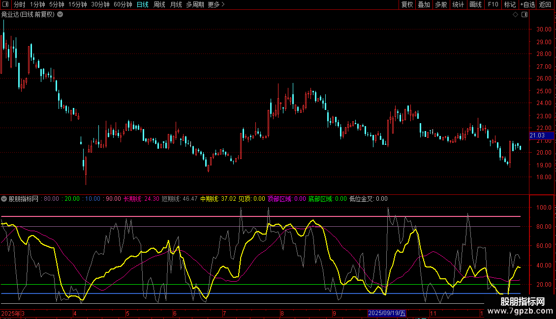 3) 3条曲线的位置,超买超卖现象类似摆动指标(20以下为超卖,80以上超买)。某些情况下有底部、抄底买点和风险区域信号提示,方便用户了解当前股价状态。