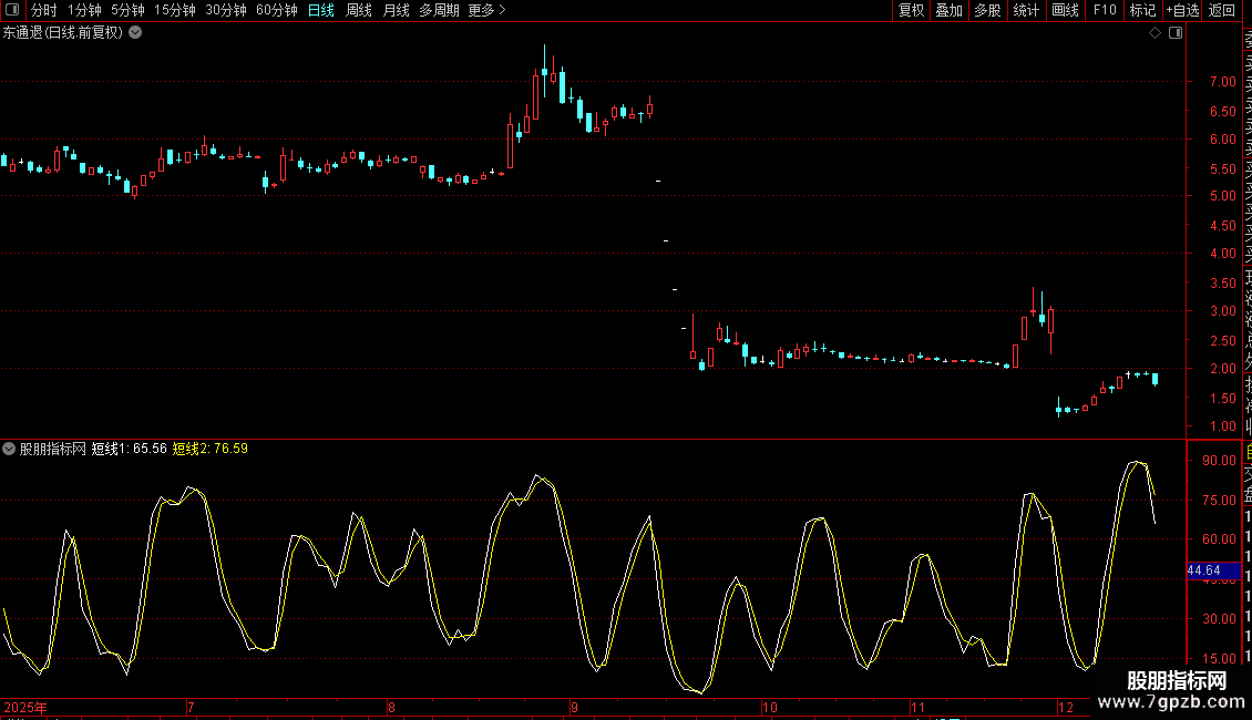 当白线从下向上穿过黄线,且两者的交叉点小于35的时候,尾盘跟进。