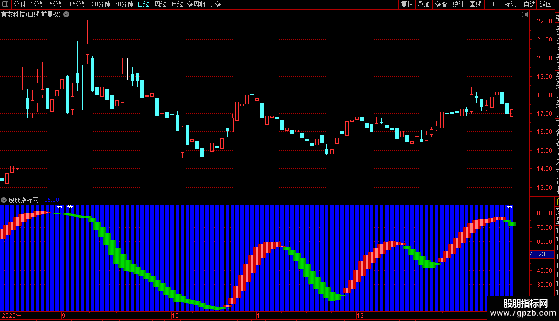 当满足条件K上穿DAND(D<18)时,在15位置书写文字,COLOR00FF00