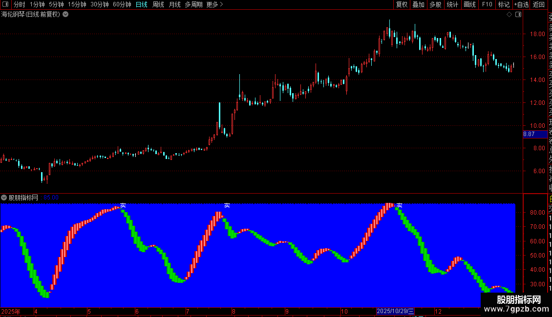 当满足条件(K<=D)时,在K和D位置之间画柱状线,宽度为1,0不为0则画空心柱.,COLOR00DD00