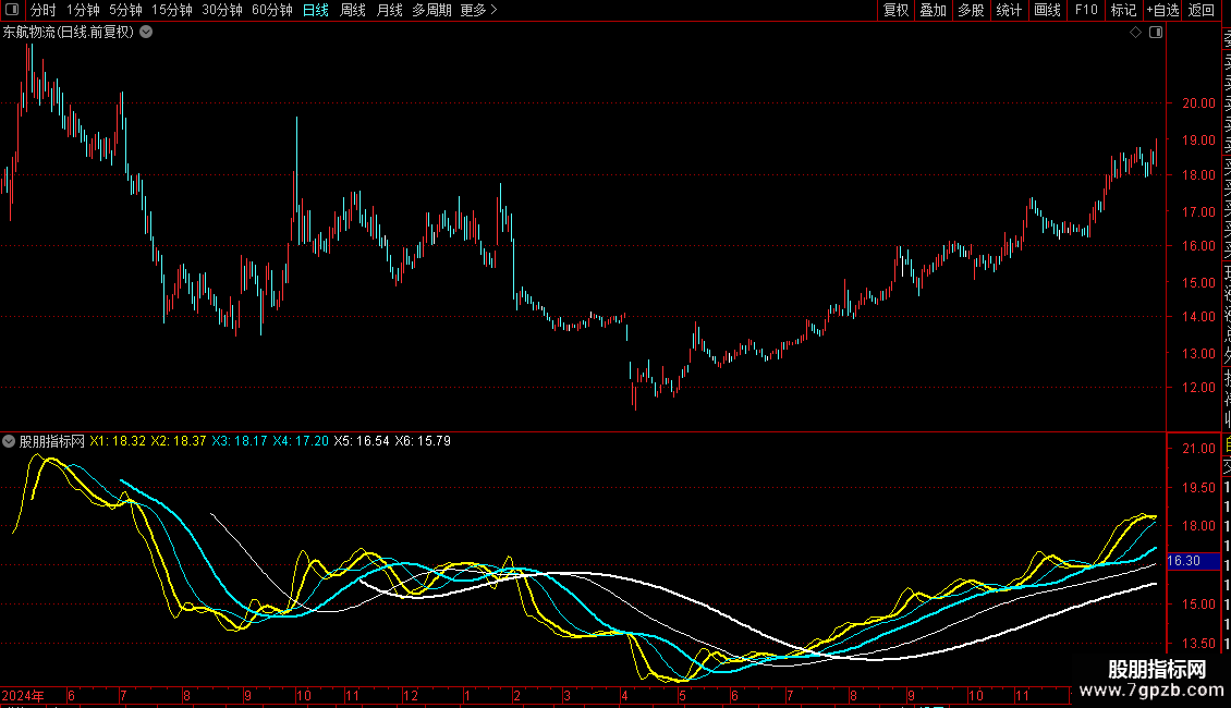 {自适应均线系统包含短线(黄色),中线(兰色),长线(白色)三套均线