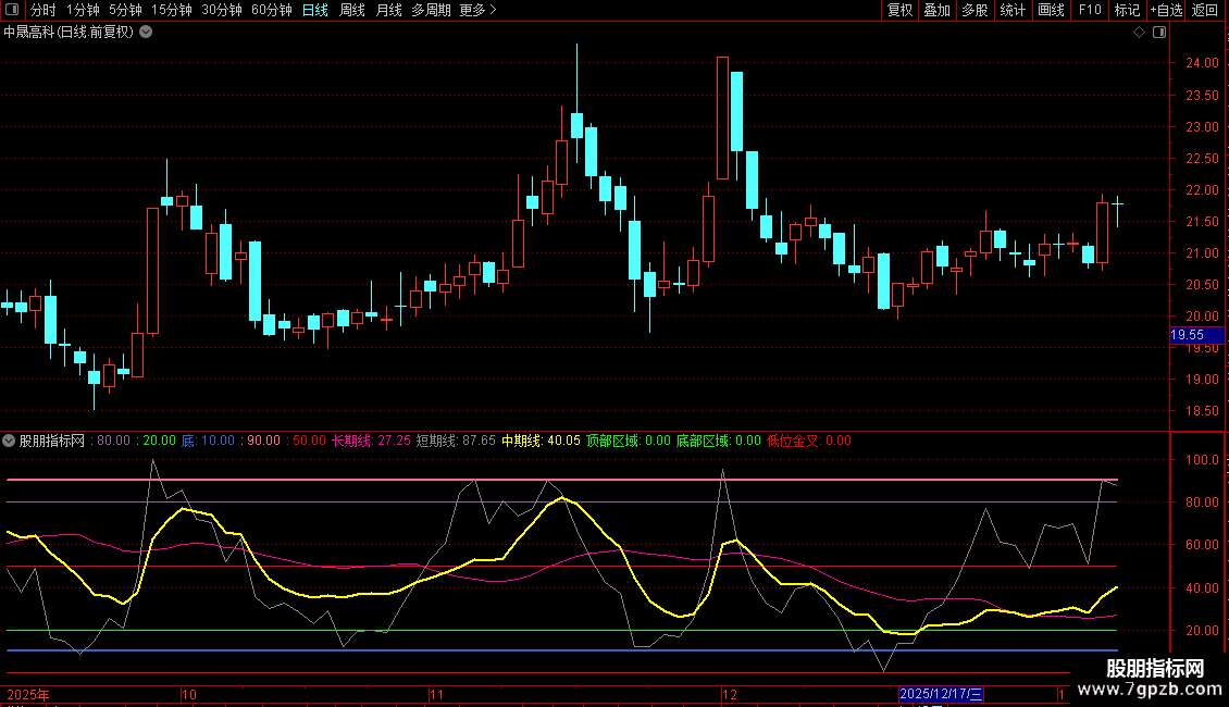 顶部区域:(中期线<REF(中期线,1) AND REF(中期线,1)>80) AND (REF(短期线,1)>95 OR REF(短期线,2)>95 ) AND 长期线>60 AND 短期线<83.5