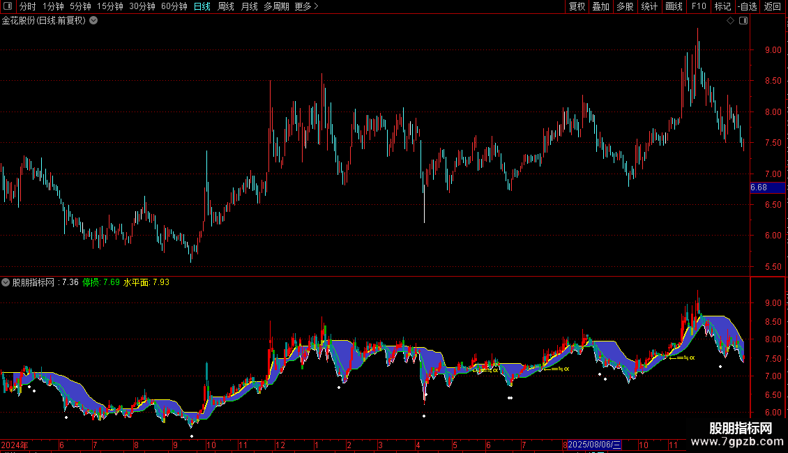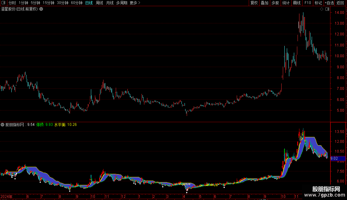 停损下限:=IF(LLV(MA(B2,8),3)<B2,LLV(MA(B2,8),3),B2),COLORWHITE,LINETHICK1,POINTDOT;